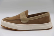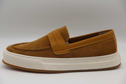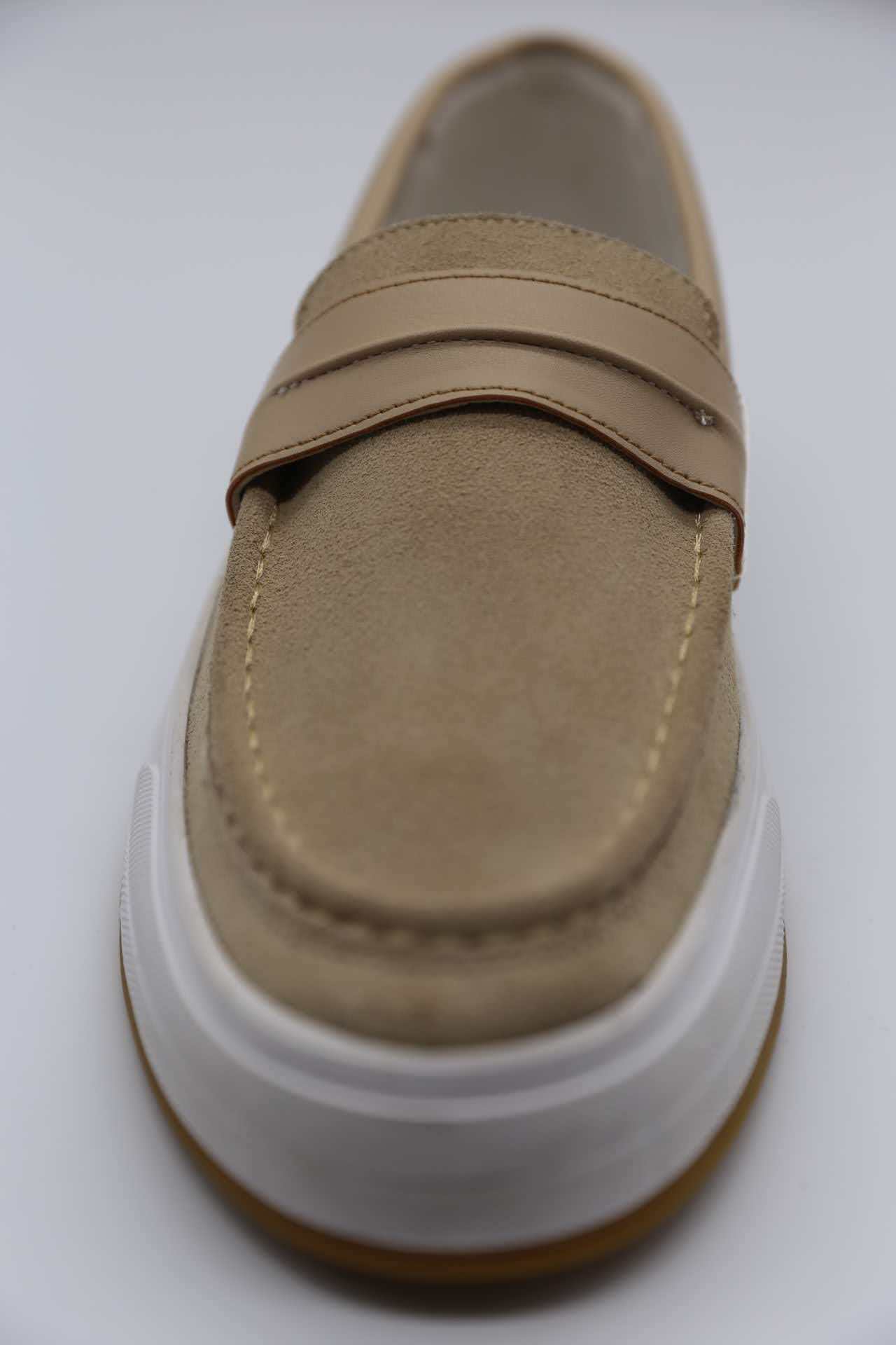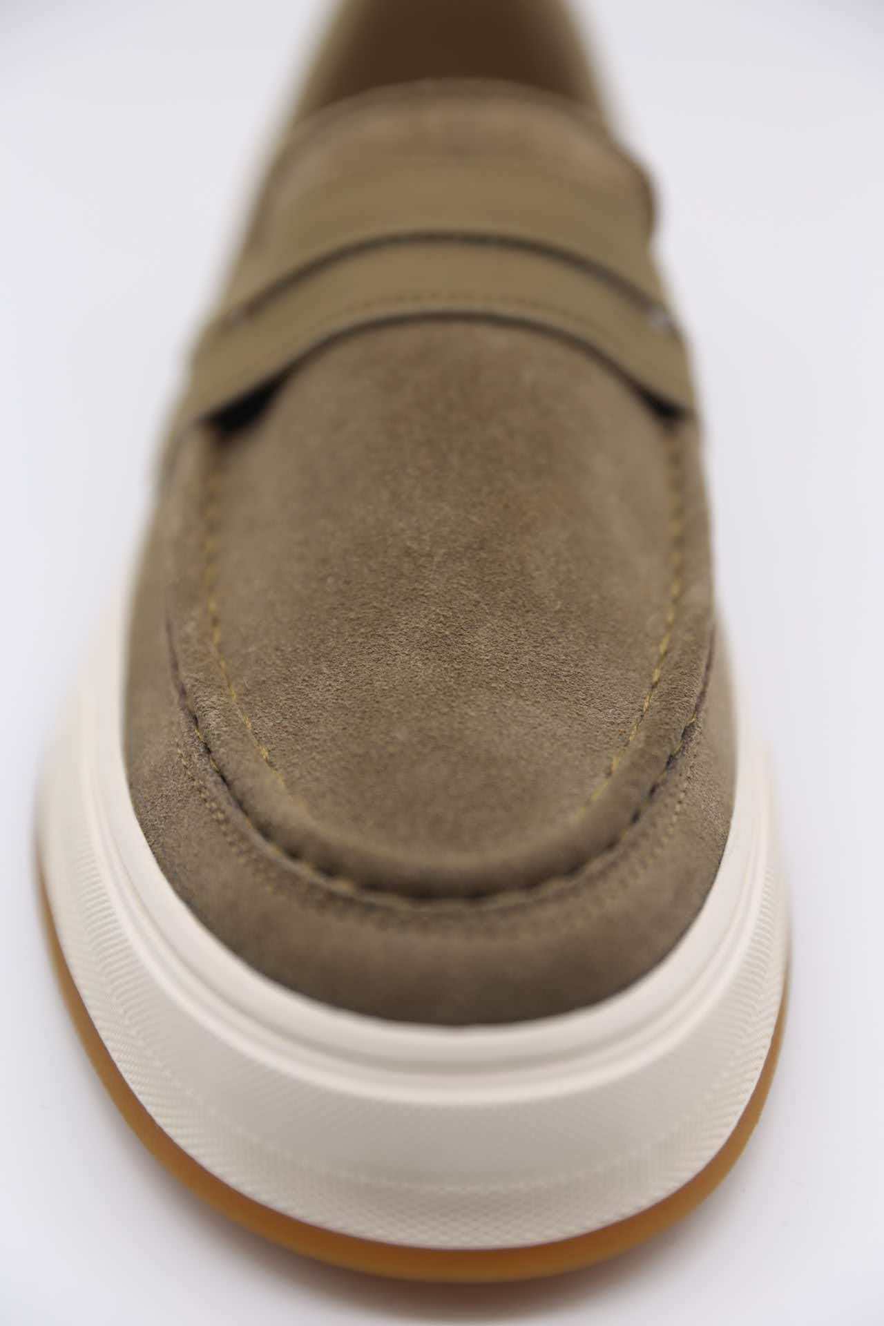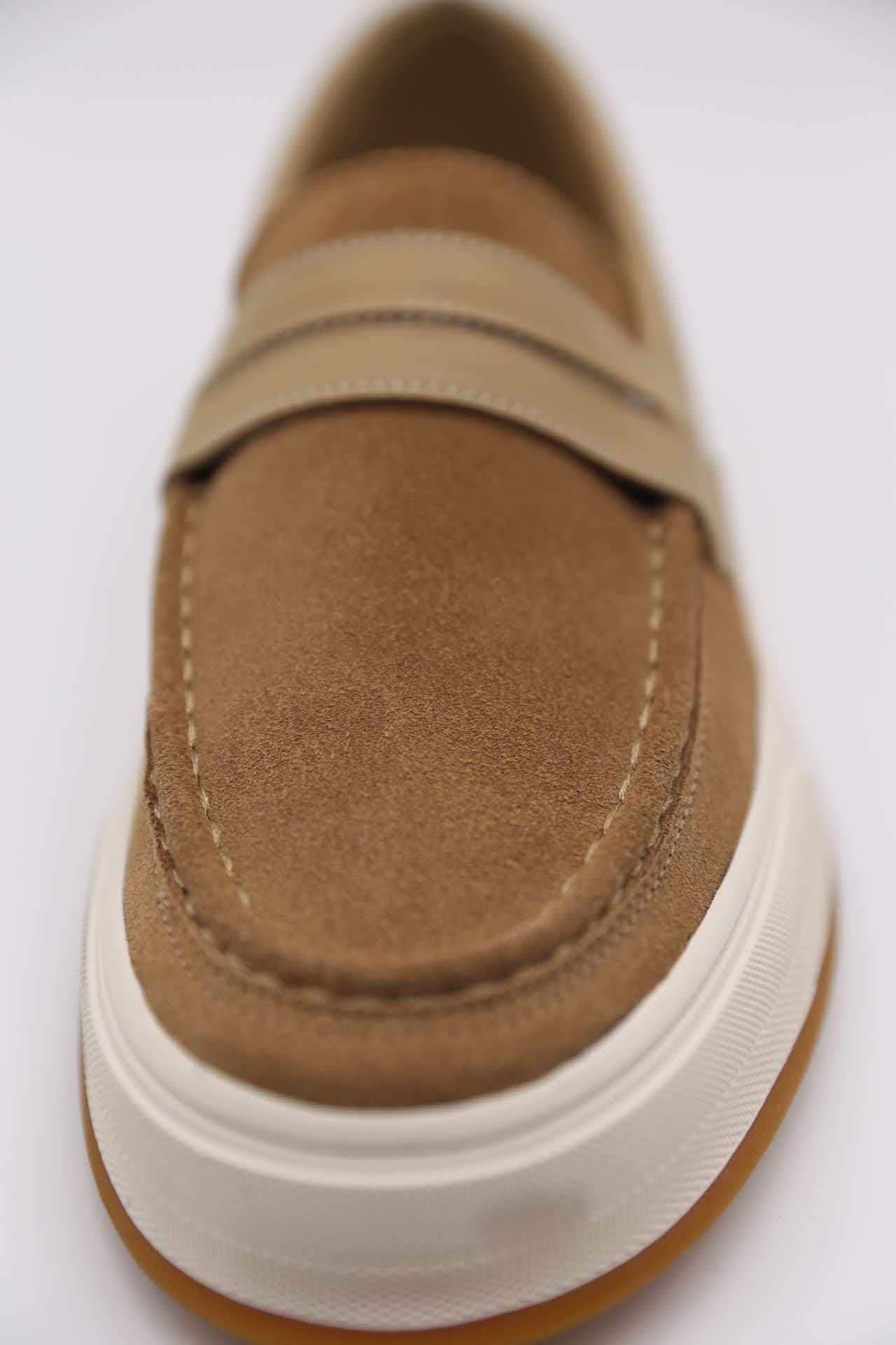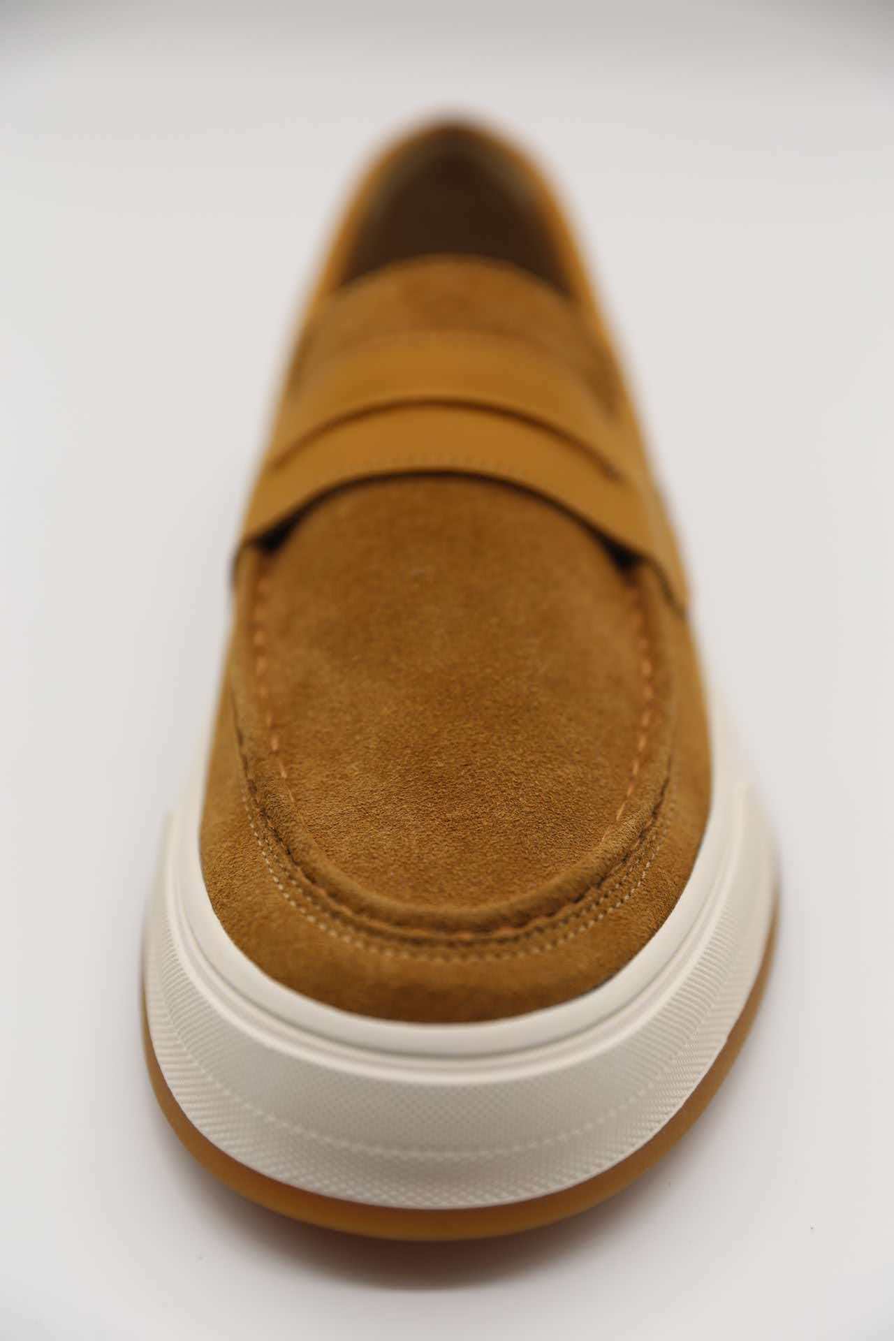 The upper is primarily made of suede (cow suede / brushed leather), featuring a fine texture and a sophisticated matte vintage style; the shoe is adorned with leather trim in a matching color, enhancing its refined silhouette and distinctiveness